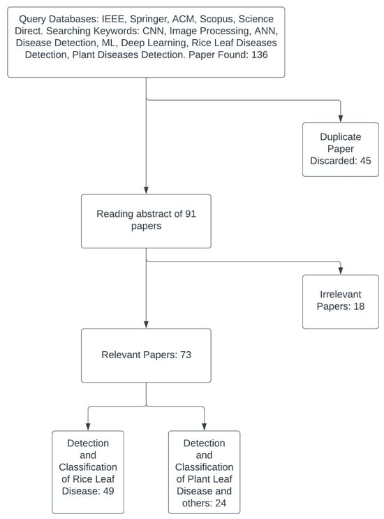 Exclusion procedures: The study excluded papers that did not focus on detecting and grouping rice or other plant leaf diseases using deep learning/CNN. However, we kept some papers related to image enhancement in case they could improve the detection or classification performance.