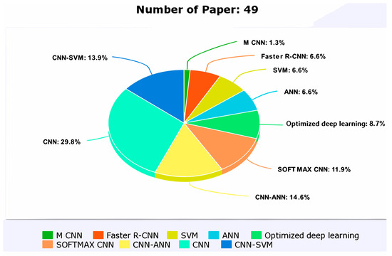 An SVM classifier uses genetic algorithm (GA) to select the desired qualities and limitations. The study’s findings revealed that the proposed approach achieved a validation accuracy of 87.9% and a positive predictive value of 91.8% in effectively differentiating between healthy and infected seedlings [57]. CNN and deep learning algorithms were used for leaf disease detection. For testing or verification, researchers used 1426 leaf images as a dataset. The dimension of the leaf’s dataset was 222 × 222 in image processing. This dataset consists of Bacteria leaf blight, Brown Spot, Brown Plant hopper, False Smut, and Stemberg images. CNN recognized the accuracy as 95% in disease detections and classifications [68].