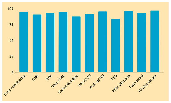 The reliability of the various techniques has been displayed using a graph in Figure 5. The accuracy level of various classifiers of machine learning and deep learning, and also other types of algorithms applied in the detection of leaf disease, are explained in Figure 5. In order to identify different types of leaf disease, several ML algorithms were used with image processing techniques.
