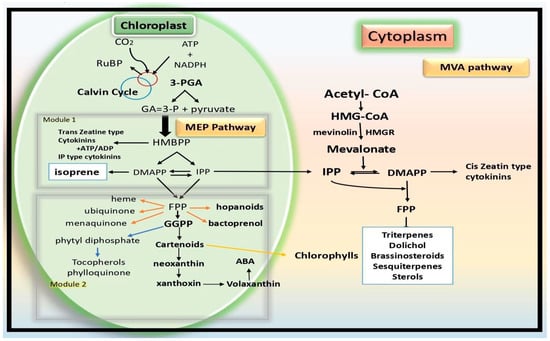 Volatile organic compounds (VOCs), a type of phytochemical among secondary metabolites, are responsible for chemical signaling molecules that are involved in intra- and interplant communication, benefiting the health of both the emitter and adjacent beneficiary plants [4]. Isoprene (C5H8), which is small and volatile, is produced at the chloroplast through the 2-C-methyl-d-erythritol 4-phosphate (MEP) pathway. The synthesis of one isoprene molecule requires 14 NADPH and 21 ATP, indicating that it is energy- and carbon-intensive. The final step in the production of isoprene involves converting dimethylallyl diphosphate (DMADP) to isoprene, which is catalyzed by the enzyme known as “isoprene synthase” (IspS). In addition to producing hemiterpene isoprene, DMADP serves as a substrate for synthesizing several other important molecules such as monoterpenes, pigments including carotenoids, chlorophyll prenyl chains and cytokinins; hormones like abscisic acid (ABA); and pigments too [5].