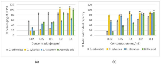 Table 8 and Figure 1 show the antioxidant properties of the screened extracts. Plant species which showed a higher and stronger antioxidant activity than that of ascorbic acid were the C. orbiculata methanol extract (0.10 ± 0.03 µg/mL) and D. sylvatica aqueous extract (0.12 ± 0.03 µg/mL). Good antioxidant activity was also observed with the L. clavatum aqueous extract with an IC50 value of 0.18 ± 0.02 µg/mL. The L. clavatum ethanol and methanol extracts displayed antioxidant activity at IC50 values of 0.24 ± 0.04 µg/mL and 0.25 ± 0.06 µg/mL, respectively.