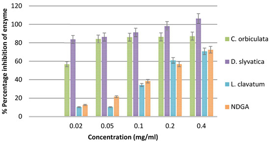 All of the extracts examined inhibited the 5-LOX enzyme more effectively than the conventional anti-inflammatory medication (NDGA). NDGA’s IC50 value in this investigation was 0.58 ± 0.35 µg/mL. The IC50 value for the C. orbiculata ethanol extract was 0.09 ± 0.02 µg/mL, whereas the IC50 value for the C. orbiculata methanol extract was 0.26 ± 0.04 µg/mL. The ethanol extract of L. clavatum had an IC50 value of 0.02 ± 0.08 µg/mL (Table 9 and Figure 2). All of these IC50 values were lower than the norm and statistically different (p < 0.05).