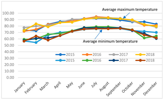Average maximum and minimum monthly temperature during 2015 to 1018 at Canal Point, FL, USA.