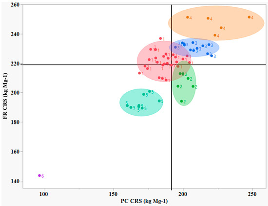 The Shapiro–Wilk test was used to verify the normality of residues before performing the cluster analysis of the CRS content. Cluster analysis for CRS content was performed over all crop harvests using Ward’s method [26] by scoring the squared Euclidian distance in JMP Pro 17.0.0 software [22]. The cluster analysis was used to generate a scatter plot matrix of PC_CRS and FR_CRS for the 55 sugarcane genotypes and four check cultivars.