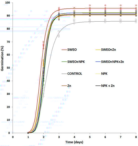 Germination curves of seeds treated with different biostimulants. Curves were generated by fitting the three-parameter log-logistic model (2).
