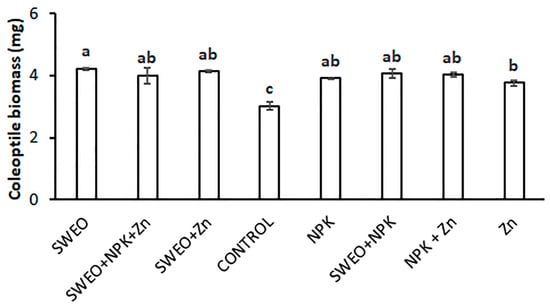 Different seed dressings significantly influenced the biomass of the coleoptile of durum wheat seedlings (p < 0.001). Again, the SWEO treatment produced the highest biomass (4.2 mg), but the effect was less evident than that obtained for coleoptile length (Figure 5). The application of mixtures did not produce an effect significantly different from that of the single components. The Zn treatment resulted in a coleoptile biomass significantly lower than the SWEO treatment did, with a decrease of about 10%. The Zn seed dressing, however, still produced a 23% enhancement as compared to the control (3.0 mg).