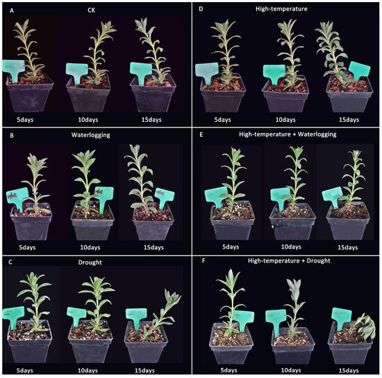 A total of 180 cuttings were pretreated in an artificial climatic chamber for 7 days. The temperature was set to fluctuate between 25 °C during the day and 20 °C at night, with a photoperiod of 14 h of light and 10 h of darkness. Indoor humidity was maintained at 50%, and the light intensity was set at 10,000 lux. Following this adaptation period, A. repens was subjected to six different environmental treatments. These treatments included ambient temperatures of 25/20 °C with 40% soil moisture (control group), 100% soil moisture (waterlogging group), and 20% soil moisture (drought group), as well as ambient temperatures of 35/30 °C with 40% soil moisture (high-temperature group), 100% soil moisture (high-temperature and waterlogging group), and 20% soil moisture (high-temperature and drought group). The plant samples were selected 5, 10, and 15 days after the experiment, with the samples taken from the top to the bottom of the plant at the 5th to 8th functional leaf. Each treatment consisted of 30 plants per treatment with 10 replicates. Throughout the experiment, photographs were taken to document the changes in the plant morphology.