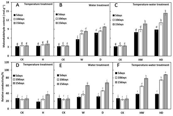A. Aeollanthus repens degree of plant tissue stress injury under different treatment conditions. MDA content (A–C), relative conductivity (D–F). CK: “control group”, W: “waterlogging stress group”, D: “drought stress group”, H: “high-temperature stress group”, HW: “high-temperature and waterlogging stress group”, HD: “high-temperature and drought stress group”. Statistical significance was determined using one-way ANOVA, followed by Duncan’s multiple range test. Different lowercase letters indicate significant differences among different treatments according to DMRT (p < 0.05). Error bars represent the standard error of the mean.