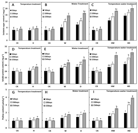 Changes in the content of osmolytes in A. repens under various treatments. (A–C) Soluble sugar content, (D–F) soluble protein content, (G–I) proline content. CK: “control group”, W: “waterlogging stress group”, D: “drought stress group”, H: “high-temperature stress group”, HW: “high-temperature and waterlogging stress group”, HD: “high-temperature and drought stress group”. Statistical significance was determined using one-way ANOVA, followed by Duncan’s multiple range test. Different lowercase letters indicate significant differences among different treatment according to DMRT (p < 0.05). Error bars represent the standard error of the mean.