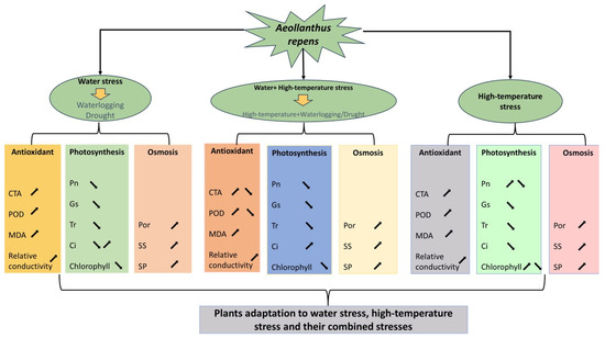 Plants’ resistance to heat and water stress is determined by a multitude of factors, and relying on a single indicator may not accurately gauge their resilience. In our experiment, we selected 12 stress tolerance indicators to comprehensively evaluate the adaptability and stress tolerance of A. repens using fuzzy membership function analysis. The results revealed that the plants exhibited satisfactory growth in both ambient and high-temperature environments and displayed high resistance to waterlogging stress, combined high-temperature and waterlogging stress, and drought stress conditions. Overall, the plants demonstrated excellent adaptation to both prolonged high humidity and transient drought stress environments.