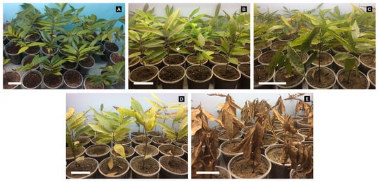 The seedlings showed gradual phenotypic changes during the progression of water stress. At 15 days, there were mild changes in their coloration; at 25 days, the leaves began to curl and wilting began; and at 35 days, leaf senescence and abscission occurred (Figure 2).