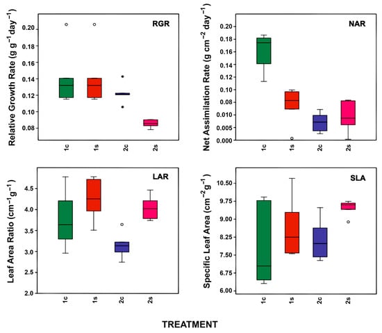 Growth analysis in A. lutescens. Relative growth rate (RGR), net assimilation rate (NAR), leaf area ratio (LAR) and specific leaf area (SLA). The box indicating the values of each water stress group is shown to the right of its respective control group: 1c = 15-day control group; 1s = 15-day water stress group; 2c = 25-day control group; 2c = 25-day water stress group. Asterisks and circles represent outliers and the colors differentiate the groups.