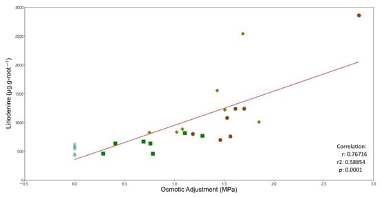 We observed a moderately strong positive relationship between osmotic adjustment and the increase in liriodenine in roots in all of the stress treatments (r2 = 0.58, r = 0.76, p = 0.0001, y = 594x + 357.66) (Figure 4).