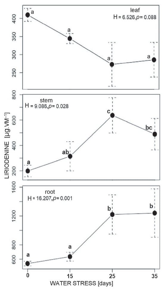The concentration of liriodenine in leaves tended to decrease as the duration of water stress increased; however, this decrease was not statistically significant. Liriodenine in stems was significantly higher than in controls after 25 days of water stress (from 199.223 to 637.286 µg g−1). The highest concentration of liriodenine occurred in the roots, and there was a significant increase from 540.855 µg g−1 at 15 days of water stress to 1239.897 µg g−1 at 25 days of water stress. These high concentrations were maintained until the 35th day (Figure 5).