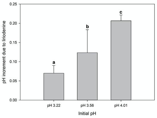 pH regulation of liriodenine in acid malic solution at different pH values (2.5 mg of liriodenine was added per 5 mL of malic acid solution 0.00106 N). The bars show the average increase in the pH of the malic acid solutions after adding liriodenine (Kruskal–Wallis p = 0.001, n = 5). The a, b, c, represent the significant differences.