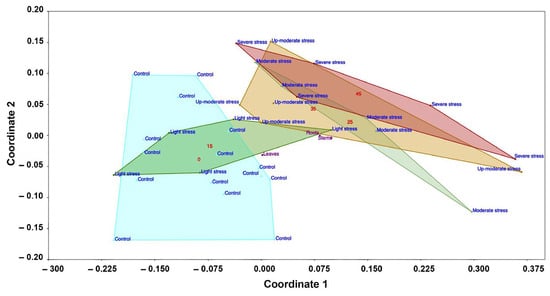 Increase in liriodenine concentration over a water stress gradient using non-metric multidimensional scaling (NMDS). The coordinates represent environmental gradients that explain the increase in liriodenine, which occurred mainly in the roots. Coordinate 1 is the moisture gradient, and the variation summarized in coordinate 2 is the three different plant tissues (leaves, stems, and roots). The control and 15-day water stress groups are in the part with the highest moisture (light blue and dark green polygons; red number 0 and 15, respectively), while the 25-day water stress group (light green polygon; red number 25) is found from the center of the gradient to the right extreme, which represents low moisture. The 35- and 45-day water stress groups are found in the gradient with the lowest moisture (right) in the yellow and red polygons (red numbers 35 and 45, respectively). The ANOSIM confirmed the groupings evident in the graph; the control and 15-day stress treatment were indistinguishable from each other but significantly different (p = 0.01) from the 25-, 35-, and 45-day water stress treatments, which were indistinguishable from each other.