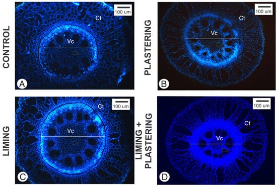 Cross-section of Pennisetum purpurem adventious root analyzed under ultraviolet light (Ex. 365 nm; Em: 420 nm). (A) Control, (B) plastering, (C) liming, and (D) liming + plastering. Ct—Cortex; Vc—Vascular cylinder.