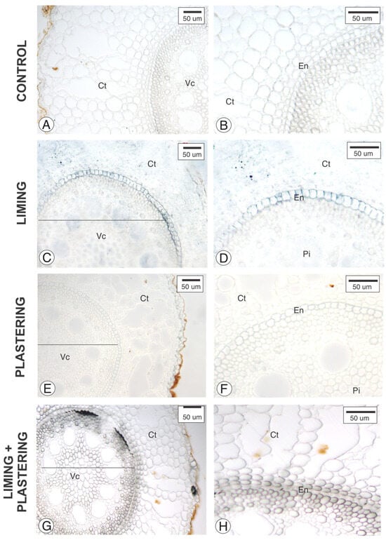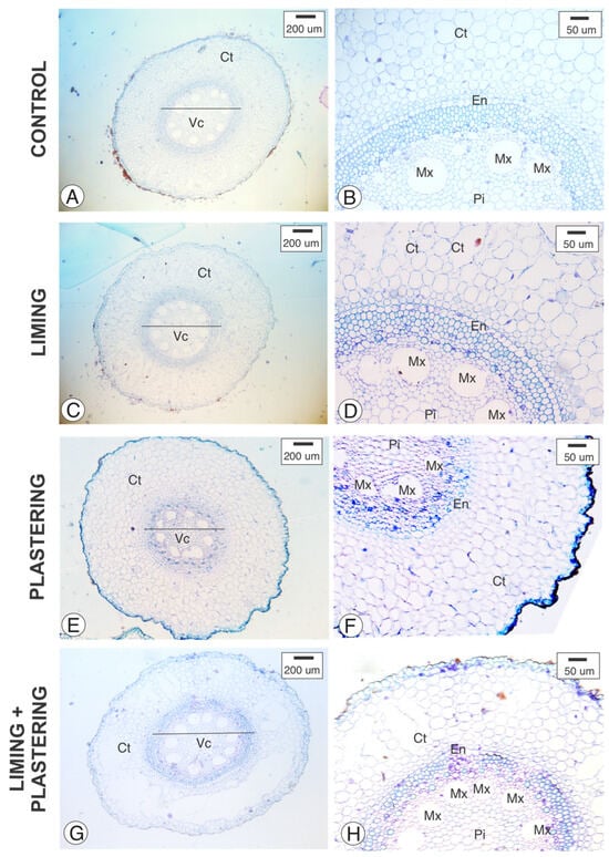 Cross-section of Pennisetum purpurem adventious root analyzed under staining with Toluidine Blue. (A,B) Control, (C,D) liming, (E,F) plastering, (G,H) liming + plastering. Ct—Cortex; En—Endodermis. Pi—Pith; Mx—Metaxylem; Vc—Vascular cylinder.