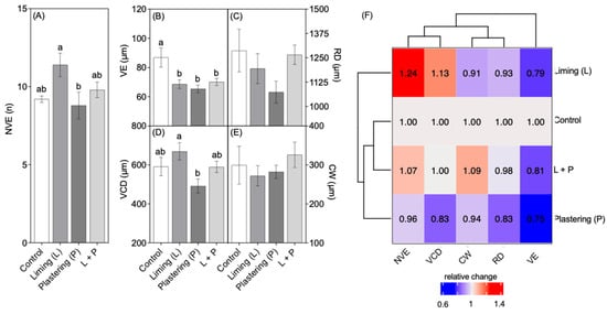 Number of vessel elements (NVE) (A), diameter of vessel elements (VE) (B), root (RD) (C), vascular cylinder (VCD) (D), and thickness of the cortex layer (CW) (E) exhibited by plants subjected to liming (L), plastering (P), or both liming and plastering (L + P) treatments (A–E). The data represent the mean ± standard error of measurements of at least four independent biological replications. Different letters indicate significant statistical differences between the treatments according to a one-way analysis of variance (ANOVA) followed by Tukey’s post hoc test, at a 95% confidence interval (p < 0.05). Heat map of the relative change of all measured variables compared to the control group (F).