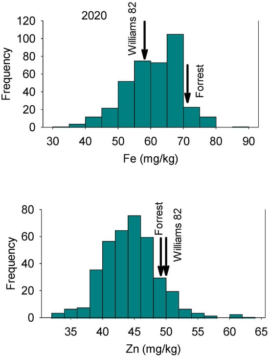 Frequency distribution for seed Zn concentration (top graph) and Zn concentration (bottom graph) in 2020 in the Forrest’ by ‘Williams 82’ recombinant inbred soybean lines (RILs) population in soybean in 2020. Gaps that exist in any distribution graph indicate there is zero line in that range.