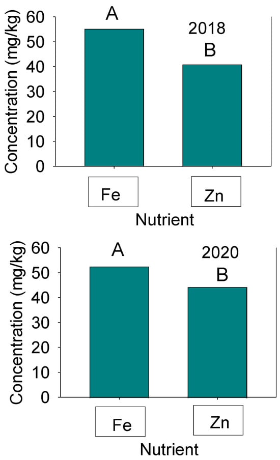 Concentrations of seed Fe and Zn in 2018 (Top graph) and 2020 (bottom graph) in the Forrest’ by ‘Williams 82’ recombinant inbred soybean lines (RILs) population in soybean. Mean (A and B) comparisons were conducted by Fisher’s Protected LSD test and the level of significance was p ≤ 0.05 using SAS.