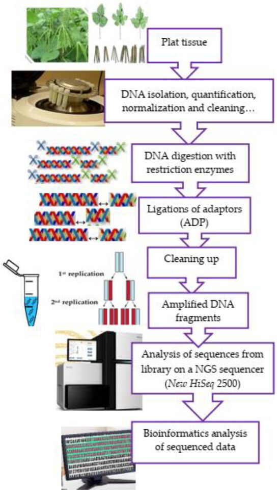 Talakayala et al. [87] worked on manipulating resistance to mungbean yellow mosaic virus (MYMV) in greengram (Vigna radiata L) through CRISPR/Cas9-mediated editing of the viral genome. In their experiment, these authors confirmed that manipulation of resistance to MYMV through the editing of the pathogen genome using the CRISPR/Cas9 tool can be a powerful approach to combat viruses and develop resistance in greengram. Lee et al. [88] experimented on the identification of a locus controlling compound raceme inflorescence in mungbean. Ha et al. [7]—from the Republic of Korea—reported a near-complete genome sequence of mungbean (Vigna radiata L.) to provide key insights into the modern breeding programme. All these studies inform possible genomic mechanisms that may be further investigated for molecular breeding improvement in mungbeans. Sandhu and Singh [89] characterised the Iowa mungbean for field adaptability traits in 2018 and 2019 and genotyped using genotype-by-sequencing (GBS) to conduct association mapping of important traits and identified genetic markers for both quantitative traits such as days to flowering, plant height, leaf drop at maturity, 100-seed weight, and Fusarium wilt score, and qualitative traits such as seed colour, seed coat texture, hypocotyl colour, and pod colour. The GBS method involves using restriction enzymes to break down genomic DNA, then ligating a barcode adaptor, amplifying the DNA pool using PCR, and sequencing the amplified DNA pool on a single flow cell lane. To analyse and interpret GBS datasets, bioinformatics pipelines are also required (Figure 2). GBS is a widely used method to generate abundant and cost-effective markers for genome-wide association studies. High-throughput sequencing technologies are intended to lower the cost of DNA sequencing beyond what is possible with standard dye-terminator methods, like in the case of the research conducted by Chen et al. [90], who generated a total of 36.18 GB of high-quality sequence data containing 183.34 M 100 bp paired-end reads after Specific Length Amplified Fragment Sequencing (SLAF) library construction and sequencing. Fatmawati et al. [91], from Indonesia, investigated the genetic variability of the F2 population of the inter-specific mungbean hybrids using retrotransposon-based markers—particularly InterRetrotransposon Amplified Polymorphism (IRAP) markers—and then identified retrotransposon from the mungbean genome and determined the Long Terminal Repeat (LTR) sequence using the LTR Finder, revealing high heterozygosity and moderate polymorphic information content.