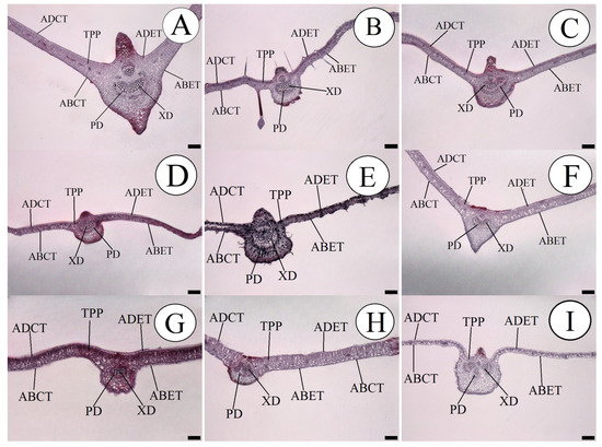 Cross-section in leaves of the passion fruit species, showing the measured internal tissues. (A) P. quadrangularis; (B) P. foetida; (C) P. edulis; (D) P. gibertii; (E) P. coccínea; (F) P. alata; (G) P. tenuifila; (H) P. caerulea and (I) P. cincinnata. ABCT—Abaxial cuticle thickness; ADCT—Adaxial cuticle thickness; ABET—Abaxial epidermis thickness; ADET—Adaxial epidermis thickness; XD—Xylem diameter; PD—Phloem diameter; and TPP—Thickness of the palisade parenchyma. Bar = 200 µm.
