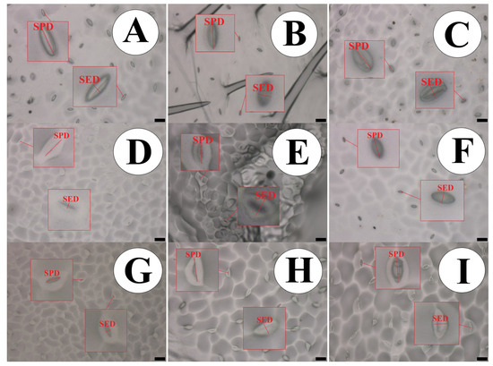 Impression of the abaxial epidermis in leaves of the passion fruit species, showing the measured structures. (A) P. quadrangularis; (B) P. foetida; (C) P. edulis; (D) P. gibertii; (E) P. coccínea; (F) P. alata; (G) P. tenuifila; (H) P. caerulea and (I) P. cincinnata. Bar = 50 µm. SPD—Stomatal Polar Diameter and SED—Stomatal Equatorial Diameter. Bar = 20 µm.
