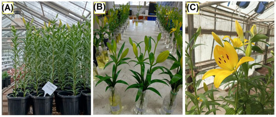 (A) Lily plants in the greenhouse on the day of foliar application, (B) after being placed in a 2 L vase filled with an acidic preservative solution in the laboratory, and (C) during the flower quality assessment.