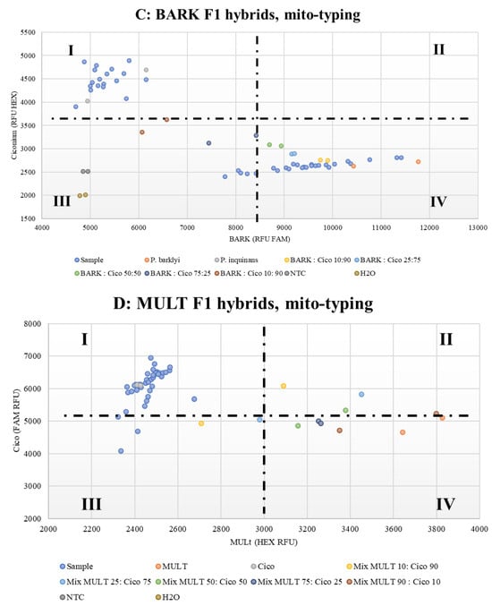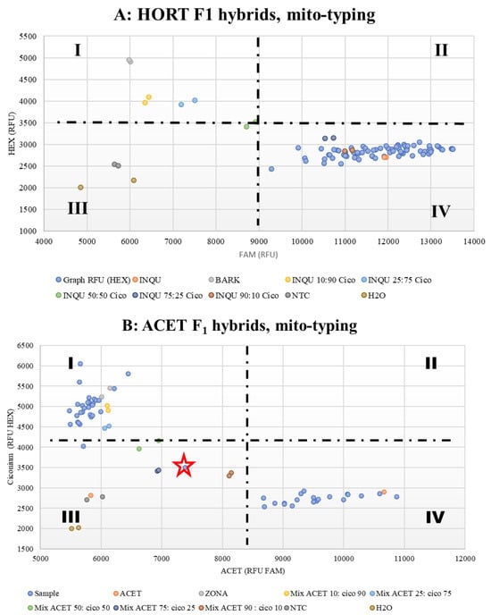 KASP allelic discrimination plots for F1 hybrid accessions from crosses involving P. x hortorum (A) P. acetosum (B), P. barklyi (C), and P. multibracteatum (D) F1 hybrid accessions. Each data point represents the fluorescence signal of an individual DNA sample, with the x-axis indicating the amount of FAM fluorescence and the y-axis the HEX fluorescence for each sample. Negative control samples are expected to be placed around the origin of the plot. Samples of the same mitotype will have generated similar levels of fluorescence and will therefore cluster together on the plot. Each graph is divided into four quadrants (I–IV). Here, the y-axis displays the values assigned to the non-target Ciconium genotypes. Hence, quadrant I holds the non-target Ciconium genotypes. Quadrant IV holds the target genotypes with target fluorescence values displayed on the x-axis. Quadrant III either contains the control samples or samples that displayed neither genotype. The star in 5B indicates biparental, F1 TONG x ACET progeny. ‘sample’ = ‘MULT/HORT/BARK/ACET’, ‘Cico’ represents all other Ciconium species. ‘mix MULT 10: Cico 90’ = a mix of the multibracteatum target and the non-target Ciconium in ratios of 10/90 (or other), ‘NTC’ = non-target control (parent), and ‘H2O’ = the water control.