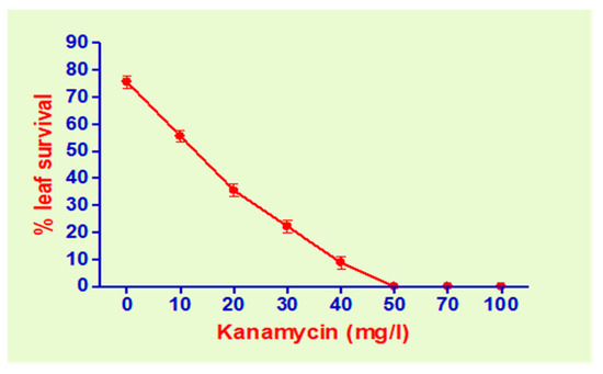 The effect of kanamycin in MS medium on the survival of leaf explants taken from microshoots of E. alba. Data were recorded after 4 weeks of culture. Values are the means of three experiments consisting of three replicates each (10 explants in each replicate).