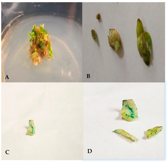 Amalgamation of 150 μM acetosyringone in the co-cultivation medium increased transient GUS activity from 43.5% to 63.4% (Table 1). Previous research has demonstrated that acetosyringone enhances the efficiency of Agrobacterium-mediated genetic transformation in various plant species by triggering the activation of vir genes through the secretion of phenolic compounds [33,34].