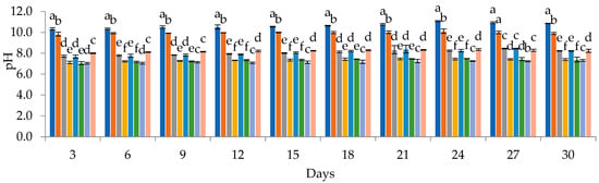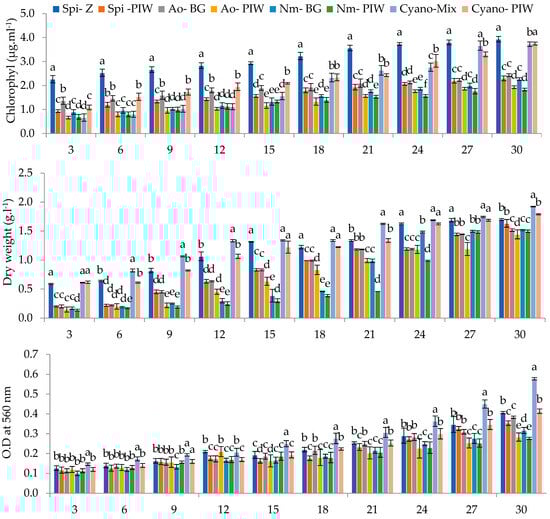 A subsequent sedimentation treatment significantly improved water quality, reducing various parameters like pH, electrical conductivity, salinity, TSS, COD, and BOD by an average of 25.04, 28.46, 25.00, 28.49, 8.78, and 23.14%. However, total nitrogen remained unchanged, and essential nutrients for algal growth like Ca, Fe, Cu, NO3-N, NO2-N, K, and P showed reductions ranging from 6.24% to 33.33%. This nutrient deficiency in pretreated PIW compared to synthetic media (Table 4) likely influenced the growth performance of the cyanobacterial strains, which was monitored by measuring chlorophyll content, dry weight, optical density, and pH at 3-day intervals, as highlighted in Figure 1. The PIW medium demonstrated favourable conditions for the growth of all tested cyanobacterial strains and their mixture, and the growth reached its peak between days 27 and 30. The chlorophyll content progressively increased throughout the cultivation period, with Spi-PIW reaching the highest value of 2.43 μg·mL−1 and Cyano-PIW attaining 3.75 μg·mL−1. Notably, Spi-PIW and Cyano-PIW exhibited higher biomass dry weights (DWs) of 1.63 g·L−1 and 1.80 g·L−1, respectively. The optical density measurements indicated significant cell growth, as evidenced by the highest values recorded on the 30th day for Spi-PIW (0.35) and Cyano-PIW (0.41), which were notably distinct from the other treatments. The pH values of microalgal cultures in PIW medium displayed variations ranging from 7.04 to 10.12, influenced by the time from the initial phase to the stationary phase, depending on the algal species. However, the highest values (pH > 9) were observed with Spirulina platensis.