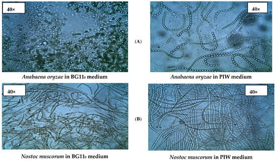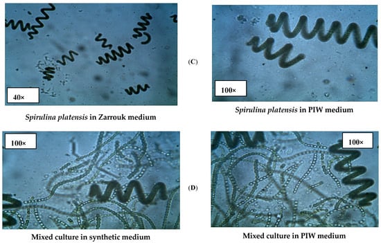 The successful growth of Spirulina platensis, Anabaena oryzae, Nostoc muscorum, and their mixed culture was confirmed in both PIW and synthetic standard media through microscopic examination, as depicted in Figure 2. The strains exhibited distinct characteristics, shapes, and growth densities, consistent with previous studies [29,30].