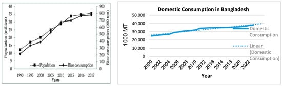 Rice is grown under a wide variety of environmental conditions, including topography, climatic factors, soil type and water regime. The continuous droughts have badly damaged agricultural production systems, with rice production being one of the most hit because the crop is more sensitive to droughts than other crops. Over the past few years, there has been a slight increase in rice consumption worldwide (Figure 1). In the 2021–2022 crop year, rice consumption globally reached approximately 520 million metric tons, compared to 437.18 million metric tons in the 2008/2009 crop year. In 2021, rice production for Bangladesh was 48,667 kg per ha [12]. In Bangladesh, recent rice consumption is 38,200 (1000 MT), which was 24,958 (1000 MT) in 2000 [13]. Day by day, the demand for rice is increasing globally due to the growing population. However, global rice output is severely hampered by drought stress conditions.