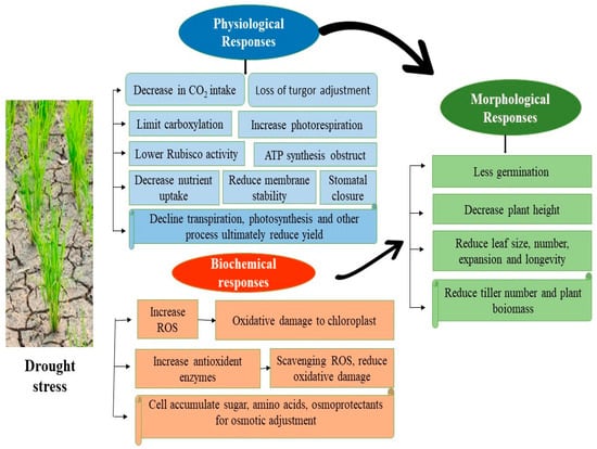 Proper irrigation is a must for rice cultivation, and more than 80% of freshwater is used for irrigation in emerging Asian countries [11]. Currently, around 1900 to 5000 L of water are required to produce 1 kg of rice grain, and it is estimated that nearly 10% of the irrigated rice will face water scarcity by 2025. To maintain agricultural productivity and environmental sustainability, effective drought mitigation methods are necessary. An overall method for effective drought mitigation includes the use of modified genotypes, the exogenous administration of osmoprotectants, plant growth regulators, and seed priming and breeding. To guarantee food security and sustainable agriculture in water-limited regions it is crucial to prioritize research in this area. Considering the facts, the present study describes the effect of drought stress on the morpho-physiological characteristics of rice as well as the activity of reactive oxygen species, osmolytes and antioxidant enzymes.