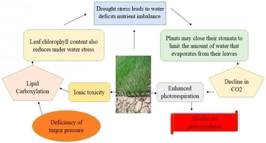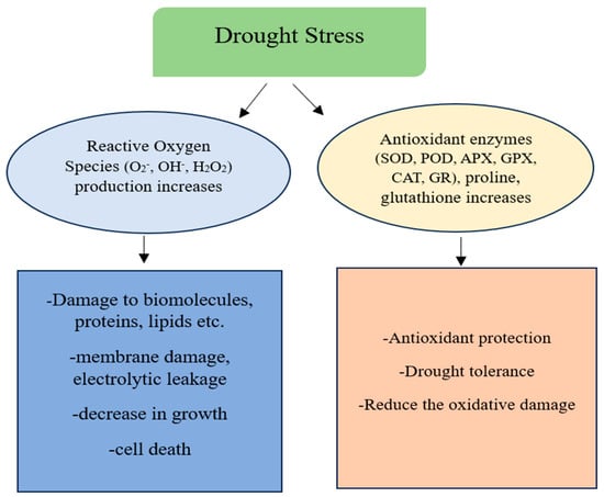 Agricultural production and productivity worldwide are affected by drought stress, which is considered one of the most significant environmental stresses and can result in significant yield reductions. Drought stress is regarded to be a loss of water, which leads to stomatal closure, a reduction in gas exchange, lower leaf water potential, turgor pressure, and a diminution in cell enlargement, growth, and the disruption of enzyme-catalyzed reactions, ultimately leading to plant mortality [16]. It inhibits plant growth by affecting various physiological, morphological and biochemical processes, including seedling growth, chlorophyll content, photosynthetic rate and water use efficiency, as well as increasing oxidative stress, which causes cell membrane damage.