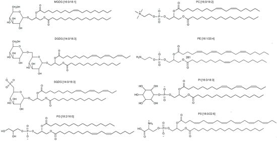 The structure of main algal glyco- and phospholipids. Monogalactosyldiacylglycerol (MGDG), digalactosyldiacylglycerol (DGDG), sulfoquinovosyldiacylglycerol (SQDG), phosphoglycerolipid phosphatidylglycerol (PG); phosphatidylcholine (PC), phosphatidylethanolamine (PE), phosphatidylinositol (PI), phosphatidylserine (PS). Lipid molecular species shown as [FA in sn-1 position/FA in sn-2 position].