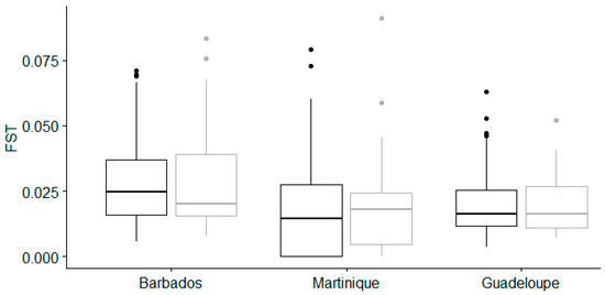 Structuration indices for isolates in plots from the same producers (‘intra’, gray boxes) vs. in plots from different producers (‘inter’, black boxes) in the three study islands (Barbados, Martinique, and Guadeloupe).