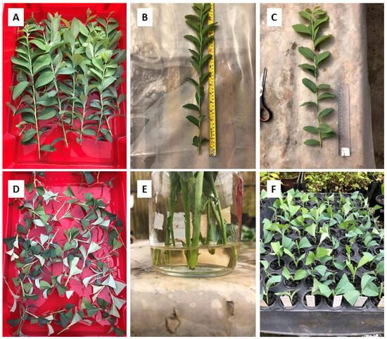 Minicutting was initially used on a commercial scale for eucalyptus (Eucalyptus spp.) [11,12,13] and showed good results for other forest species, such as Piptocarpha angustifolia [14], Handroanthus heptaphyllus [15], Acacia mearsii [16], and Aniba rosaeodora [10]. It has also been used with good results for fruit species, such as Psidium guineense, Psidium cattleyanum, and Psidium guajava [17], Eugenia uniflora [18], and blackberry [19].