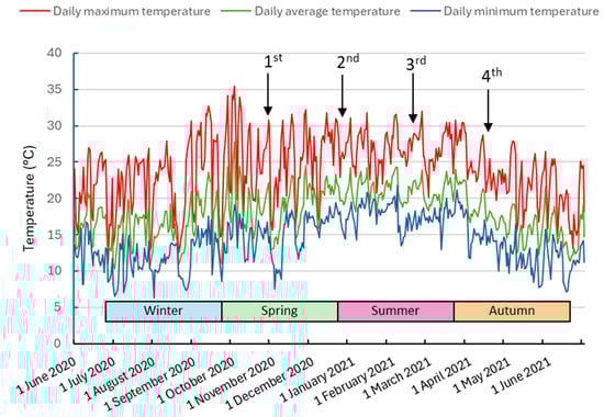 Maximum, average, and minimum daily temperature for the period from 1 June 2020 to 30 June 2021 in Curitiba-PR. Arrows indicate the dates of the 1st, 2nd, 3rd, and 4th collection of minicuttings.