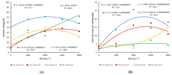 The percentage of rooted minicuttings was influenced by the application of IBA at all collection times, but in a different way. In the first three collections, the increase in IBA concentration promoted an increase in the rooting percentage up to estimated concentrations of 4500 mg L−1, 6000 mg L−1, and 5000 mg L−1, for the first, second, and third collections, respectively. In the fourth collection, the response to the application of IBA was linear, with the highest percentage of rooting (72%) being obtained with a concentration of 8000 mg L−1 (Figure 4a). This probably happened because in the fourth collection, carried out in April, the plants were already entering dormancy [27], which is a period in which the concentration of growth hormones tends to decrease, requiring a greater amount of exogenous auxin for the formation of adventitious roots. In the propagation by minicutting of the same cultivar, carried out in February with minicuttings with a whole leaf, treated with 2000 mg L−1 of IBA, and evaluated after 90 days, 95% rooting was obtained [3]. In another experiment with the Powderblue cultivar, it was observed that the rooting percentage was 55% when the evaluation was carried out 70 days after installation and 84% after 110 days [22]. This may have been one of the reasons for the lower percentage of rooting found in the present study, which was evaluated after 60 days. However, adventitious formation in blueberry cuttings is influenced by many factors, including the nutritional and physiological condition of the mother plant [20], collection time [4,5], basal lesions in the cuttings [21], and substrate used for rooting the cuttings [23].