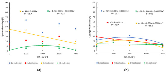 The sprouting of minicuttings was influenced by the application of IBA only in the third and fourth collections, where higher concentrations of IBA reduced sprouting. In the fourth collection, there was the lowest percentage of minicuttings sprouted due to the plants beginning to enter dormancy, which was further reduced with the increase in IBA concentration, reaching just 2% sprouting with the application of 8000 mg L−1. In the first and second collections, there was no significant effect of IBA, and the average sprouting percentage was 52.8% and 21.2%, respectively (Figure 5a).