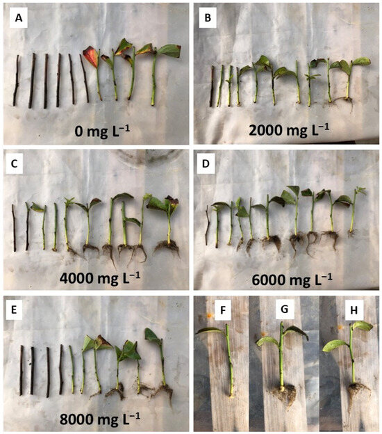 Appearance of the minicuttings 60 days after the installation of the experiment on December 21, 2020: (A) Control treatment without application of IBA; (B) Treatment with 2000 mg L−1 of IBA; (C) Treatment with 4000 mg L−1 of IBA; (D) Treatment with 6000 mg L−1 of IBA; (E) Treatment with 8000 mg L−1 of IBA; (F) Minicutting with callus and no roots; (G) Minicutting with callus and roots; (H) Minicutting with roots and no callus.