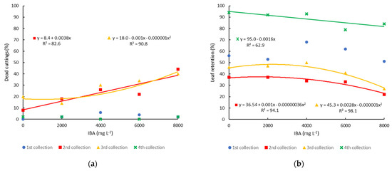Propagation of blueberry cultivar Bluegem by minicutting on four collection dates (1st collection—27 October 2020; 2nd collection—21 December 2020; 3rd collection—12 February 2021; and 4th collection—12 April 2021) and treated with different concentrations of IBA: (a) percentage of dead minicuttings; and (b) percentage of leaf retention.