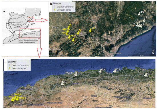 In Algeria, the populations of Q. faginea are located in the northwest, while those of Q. canariensis are located in the east (Figure 1); two localities were sectioned in three stations for Q. faginea and five for Q. canariensis (Figure 1 and Table 1).