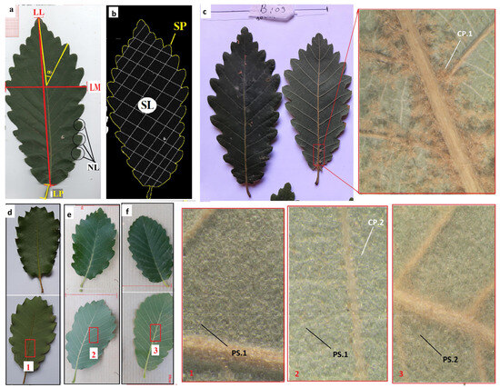 A total of nine features were studied, covering the maximum of the leaf morphology characteristics: two qualitative and seven quantitative (Table 2 and Figure 2).