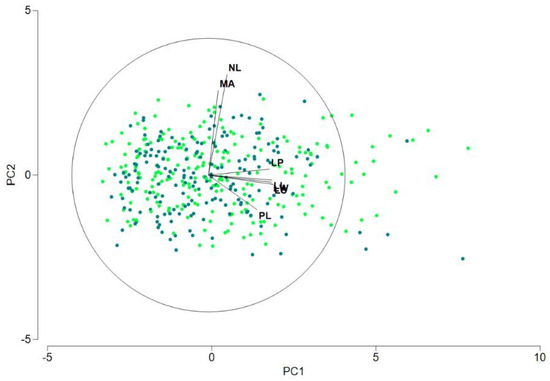 Representation of the results of a PCA performed with groups WS and WD, including the seven quantitative variables in the analysis. The two first principal components account for 60.3% and 14.9% of the total variation, respectively.