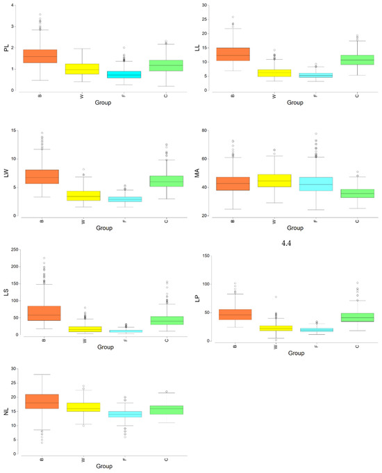 After pooling the groups WS and WD in a new group labeled W, we show the boxplots for every variable and group in Figure 5. In addition, we performed a CAP (canonical analysis of principal coordinates). Previously, to execute the analysis, all the seven variables were normalized and the matrix of Euclidean distances between all samples was calculated. In Figure 6, we can observe the results of plotting the two first axes (canonical variates). Besides the graphic, we calculated the distances between the centroids (Table 4). From our calculations, the minimum distance was 0.997 between the centroids F and W. On the other hand, centroid C was the closest to centroid B, but the distance was 1.733.