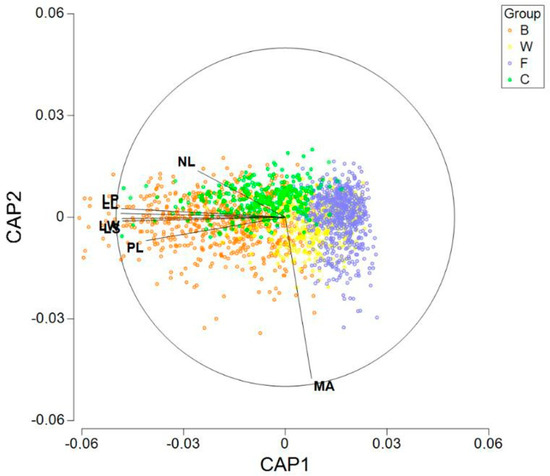 The SIMPER analysis reveals some additional results. Three variables (MA, NL and PL) jointly explain 76% of the square distances between W and F, the two closest groups. Nevertheless, no significant differences for MA was detected in the post hoc comparisons between W and F (very likely due to the high variability of this variable), so interpreting this variable must be carried out with caution. Perhaps the focus should be on LS, NL and PL when assessing the differences between W and F.